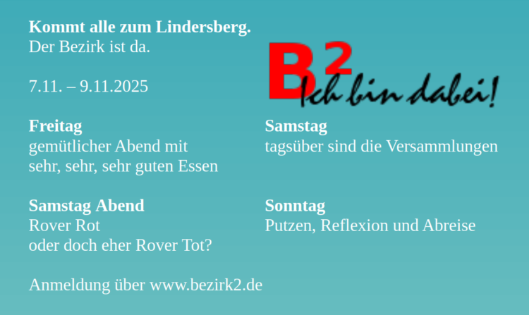 Hiermit ergeht herzliche Einladung zur ordentlichen Bezirksversammlung 2025 des Bezirk 2 der DPSG im Diözesanverband Bamberg und zu den Stufenkonferenzen – wie gewünscht – am Samstag, den 08.11.2025 im Pfadfinderhaus Lindersberg, 91320 Ebermannstadt. Noch vor dem Mittagessen um 11 Uhr und 12 Uhr finden die diesjährigen Stufenkonferenzen statt. Die ordentliche Bezirksversammlung 2025 beginnt am Samstag,…